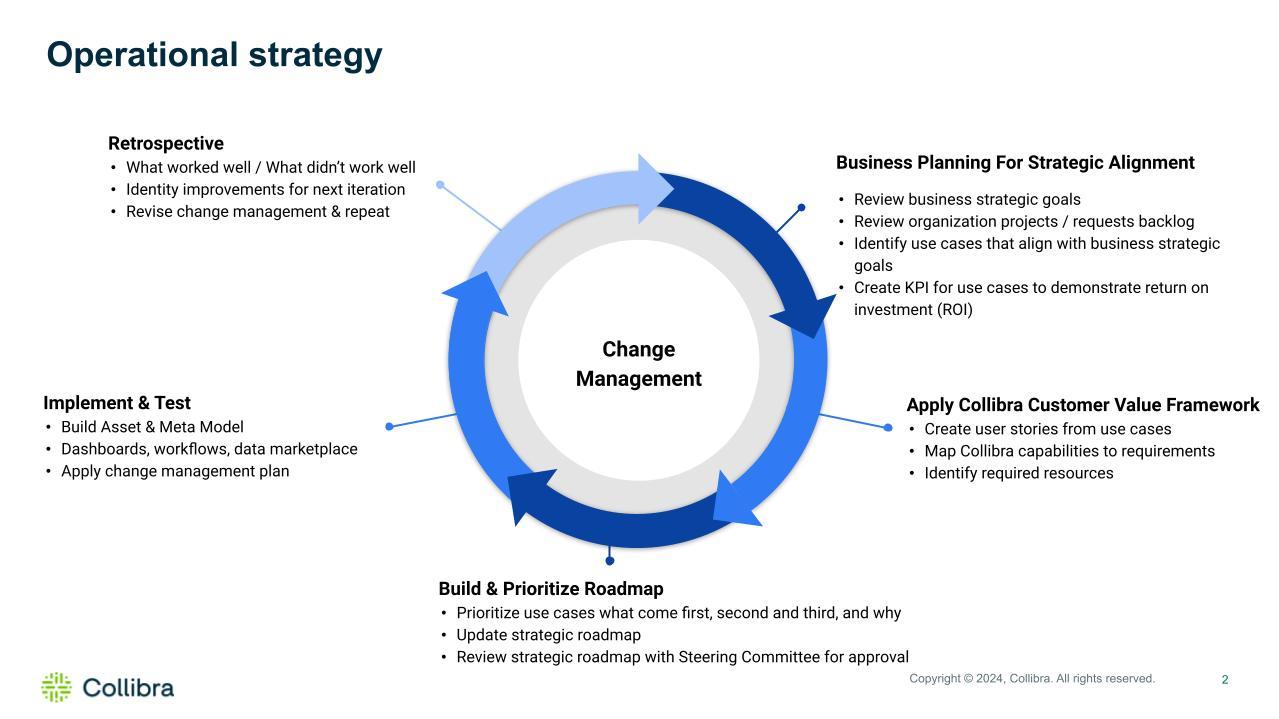 A successful data governance program must align with the business’ strategic goals and have the ability to operationalize processes, people and technology to deliver outcomes. A repeatable operational process is important to help the program continuously improve with each iteration.
