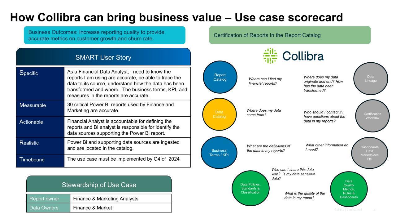The primary goal of the business is to help define the functional and technical requirements for the use case to solve the business’ pain points and problems. Business collaboration and buy-in is the foundation that will drive user adoption and return on investment (ROI) for the data governance program.