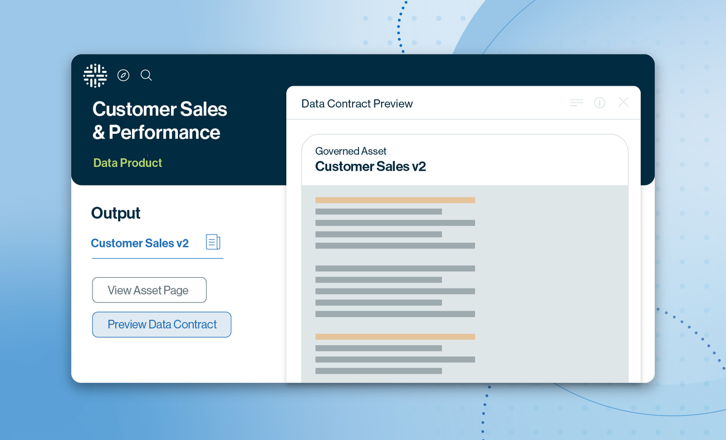Clicking “Preview Data Contract” on the data product asset page launches an inline panel that displays the data contract contents for easy, in-context review.