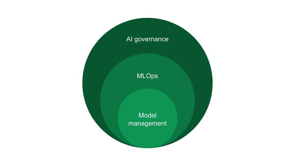 Based on these two definitions, if we wanted to visualize the relationship between AI governance and model management, it would look like the below. AI governance is the all encompassing practice of ensuring AI use case success, with MLOps being an important part of that overall process and model management being a component of MLOps.