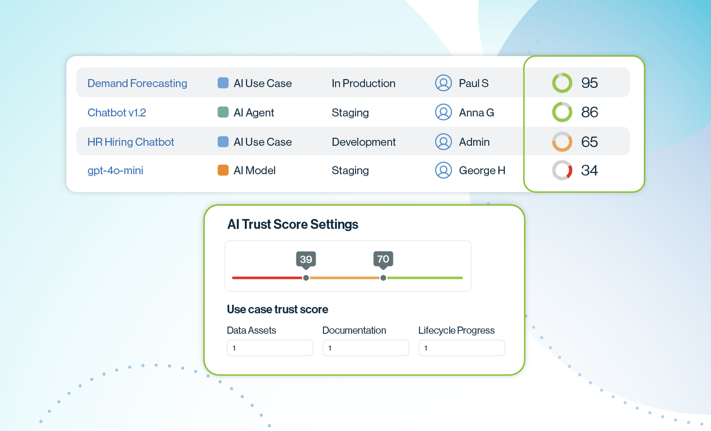 Built-in trust scores give instant insight into the reliability and risk level of each AI asset.
