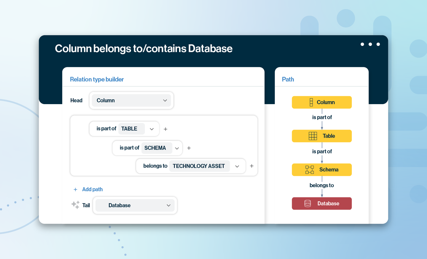 - Operating Model Administrators: Ability to define new, customized relation types to connect asset types across multiple hops or indirect relationships. This enables better business lineage and technical lineage visualization and analysis on a single asset page