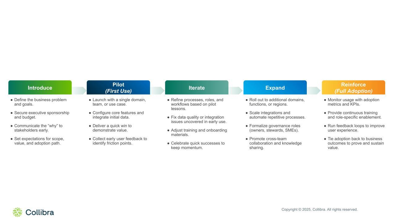 - Reinforce (Full adoption): Monitor adoption metrics, provide continuous training, and tie governance practices back to business outcomes to prove and sustain value.