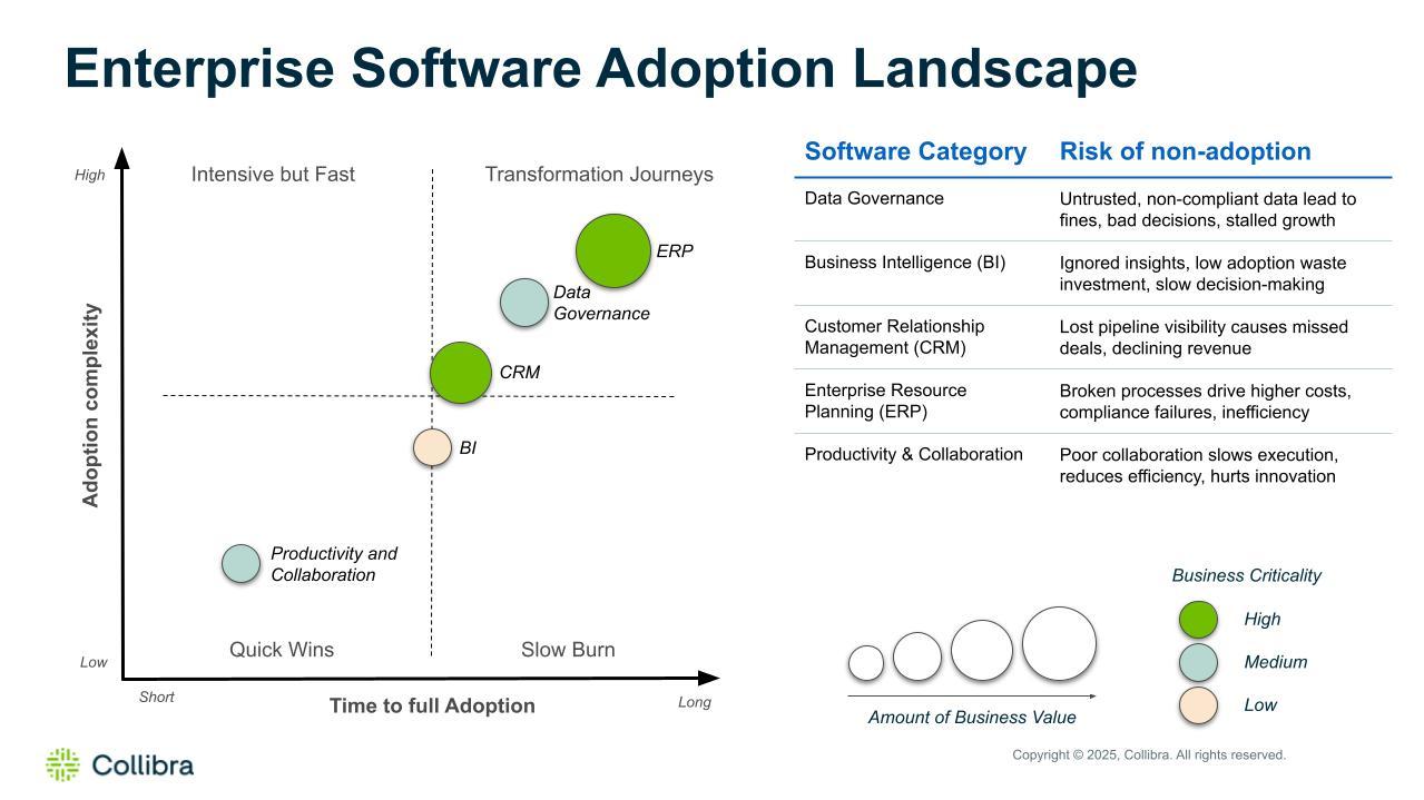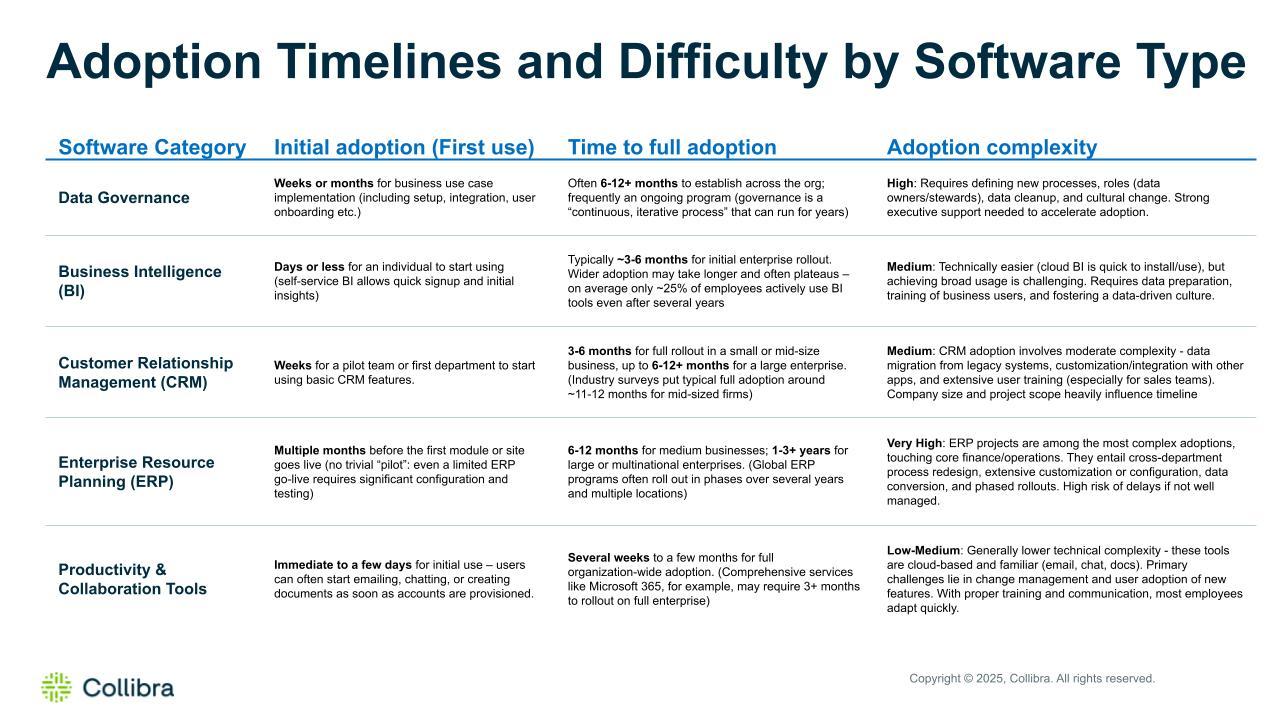 Adopting enterprise software – from initial introduction to full organizational rollout – is a complex, multi-phase process. It includes technical deployment, user training, data migration and change management. Data governance platforms in particular are often seen as difficult to adopt. But is that perception fair? And how does data governance adoption compare to other categories of enterprise software?