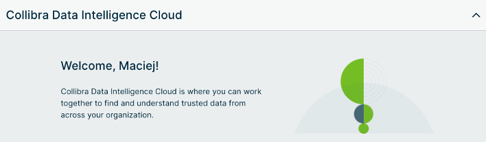 Starting at the top of the page, we have an introduction section that is there to greet the user and briefly describe what the Collibra Data Intelligence Cloud is. As you can see, we use the Username to personalize the introduction.
