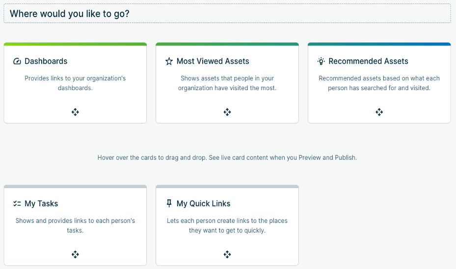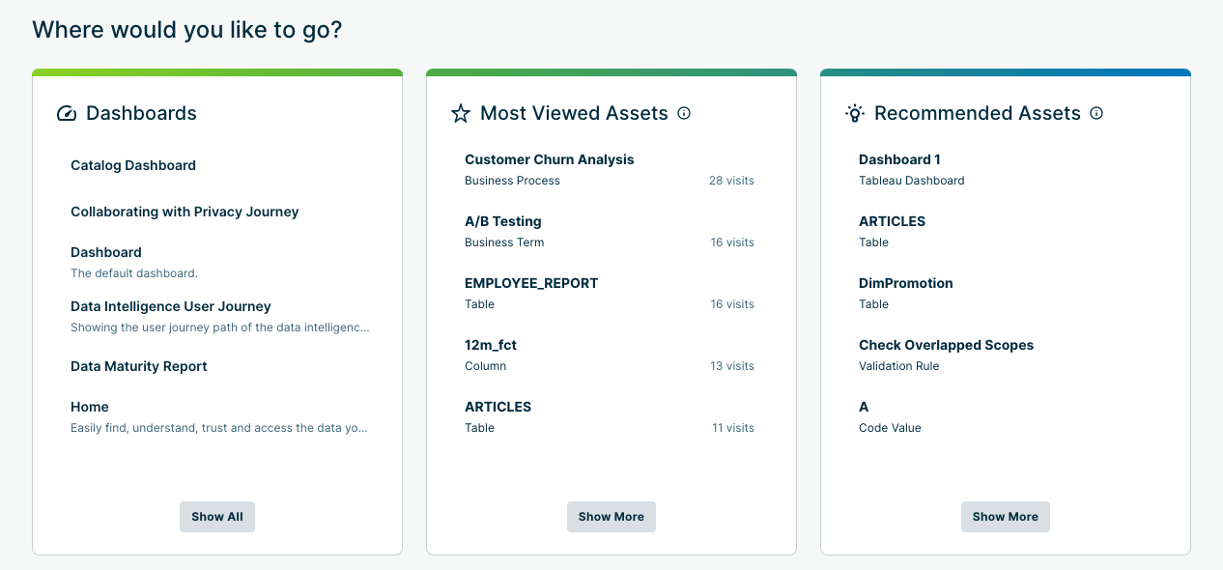 Currently, Collibra Administrators can choose 3 out of the 5 available cards to display on the Homepage. They can do this by selecting the cards while in Edit mode and moving them in the order they prefer