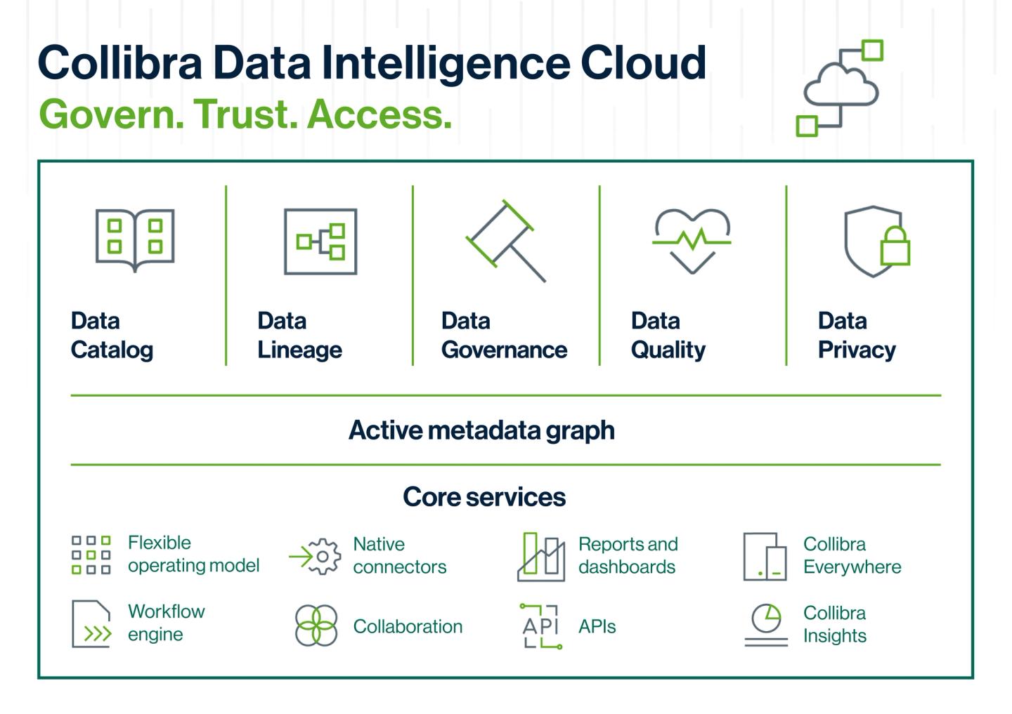 Collibra Data Intelligence Cloud is an intelligent data platform that leverages the power of machine learning and provides a holistic and integrated approach to cataloging, governing, protecting, managing and collaborating with data at scale across on-premises, hybrid and multi-cloud environments.