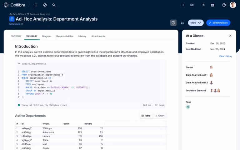 Query and document data within a governed environment to foster collaboration, ensure shared confidence in insights and enhance trusted data consumption. Publish and share SQL queries, visualizations, approaches and best practices within notebooks to boost knowledge exchange and productivity.