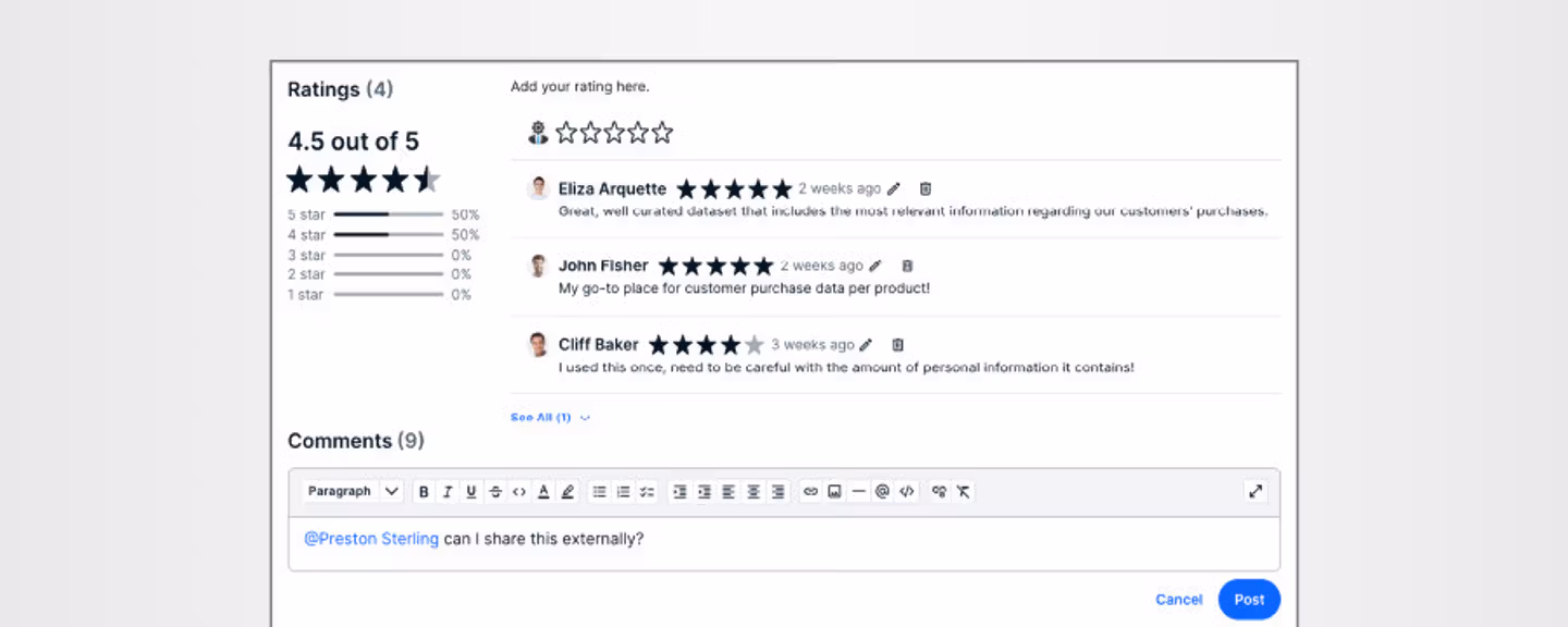Accelerate data discovery, understanding and access. Discover, understand and simplify access to your data through 100+ native data connectors, automated profiling, curation and enrichment, and an intuitive data marketplace experience.