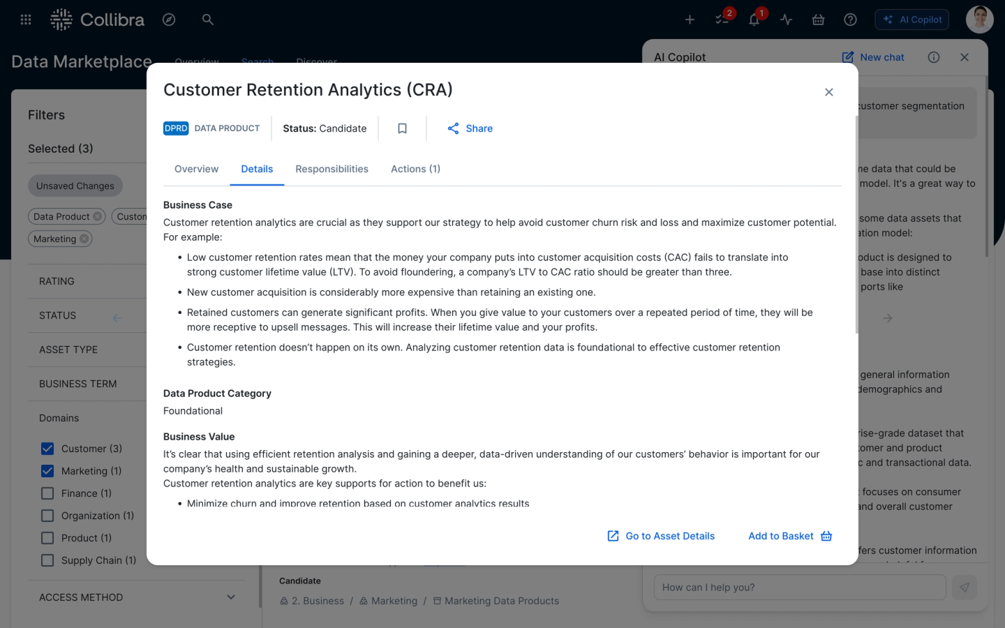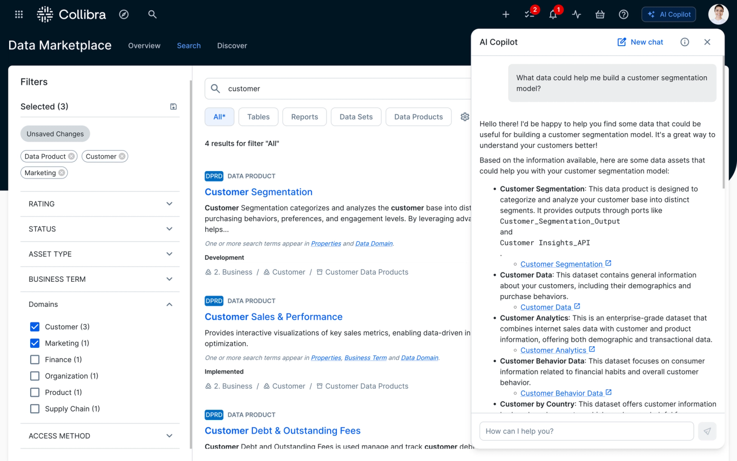 Help users at all levels find the right data products with Collibra AI Copilot. Ask questions in plain language and get accurate, relevant results instantly
