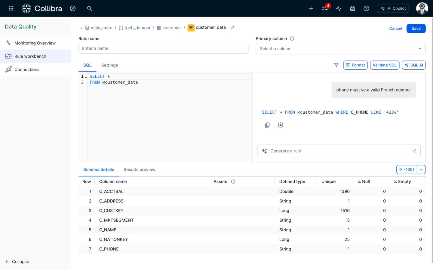 AI translates natural language rules into SQL, enabling non-technical users to add business-specific rules without coding - Reduce alert fatigue