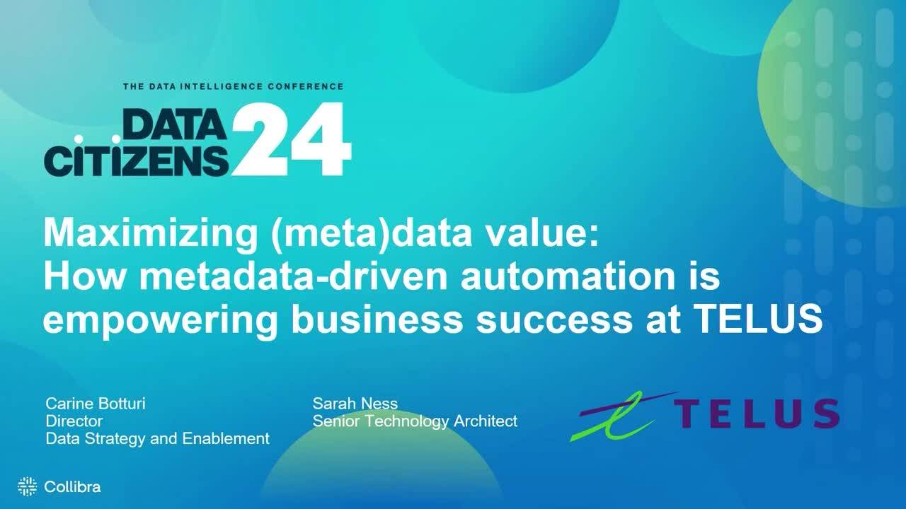 As the volume of data continues to increase rapidly, automation is becoming more essential for maximizing data value. In this session, recorded at Data Citizens ‘24, TELUS shares how they are leveraging automation driven by metadata to discover, understand, trust, track and observe data in real time, enabling various business use cases within their organization. Learn how they’ve established a foundation of capabilities ensuring that their metadata is properly governed and maintained to drive excellence across the business.